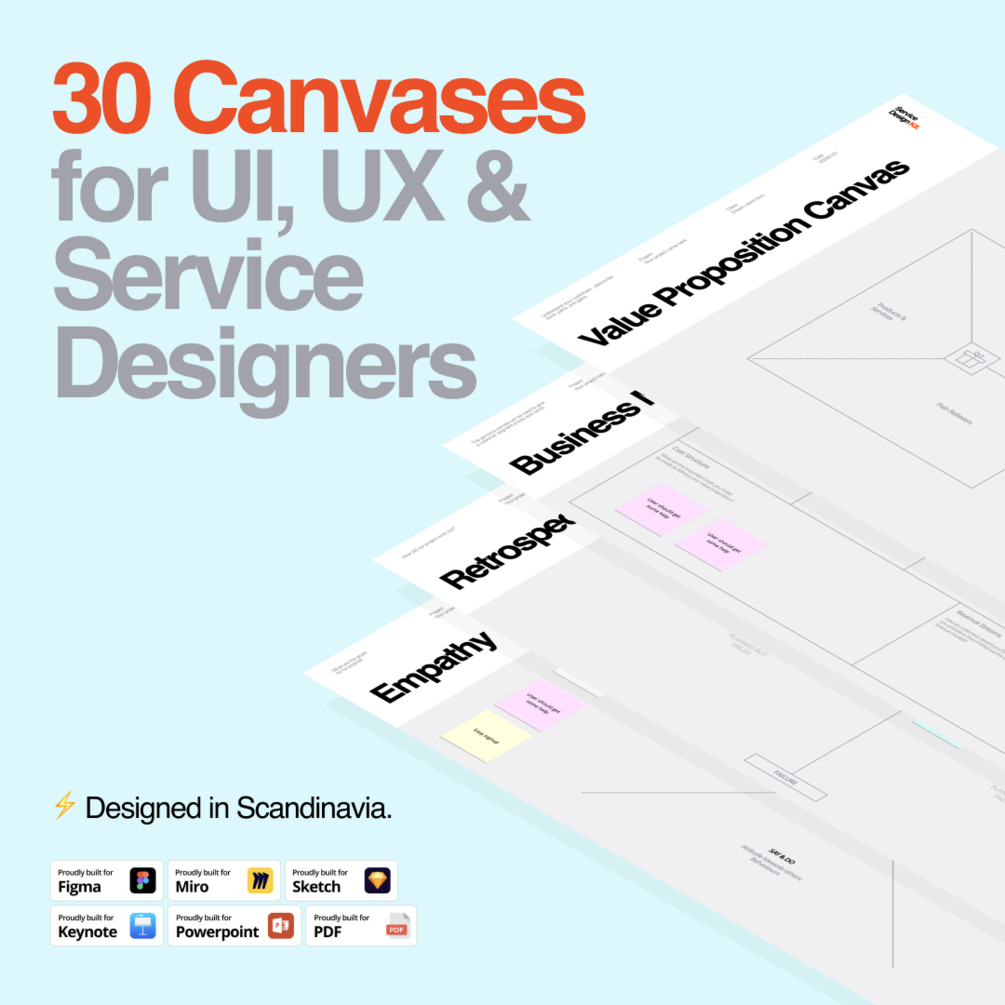 Become a service design master with this canvas pack. Anyone can apply service design thinking tools and methods to develop or improve services. Kick-start your projects with drag & drop pre-made components ready-to-go.